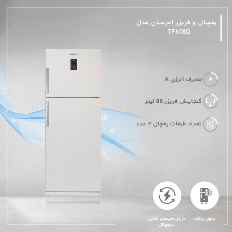 یخچال فریزر 18 فوت مدل «TFN18D» یکی از یخچالهای ساده، بهصرفه و کممصرف از سری یخچالهای بالاپایین شرکت امرسان (Emersun) است که به دلیل فضای مناسب داخل یخچال، یکی از پرطرفدارترین مدل یخچال و فریزرهای ایرانی است. شرکت صنایع امرسان یکی از پیشروهای صنعت در حفاظت از محیط زیست است از این سو امرسان در تولید محصولات لوازم خانگی ایرانی از تمام توان خود جهت تولید محصولات دوستدار محیط زیست استفاده میکند، از این رو گاز تبریدی و مواد مورد استفاده برای عایقبندی این محصول کاملا دوستدار محیط زیست هستند. گنجایش کلی این محصول ۳۸۰ لیتر است که سهم یخچال ۲۷۰ لیتر و سهم فریزر ۸۶ لیتر است که فضای نسبتا کمی برای سردکردن و فریز کردن مواد غذایی محسوب میشود. از ویژگیهای این یخچال میتوان به سیستم کنترل دیجیتال مجهز به نمایشگر تاچ پنل، سیستم عیب یابی هوشمند، سیستم گردش هوای اجباری و سیستم انجماد سریع اشاره کرد.